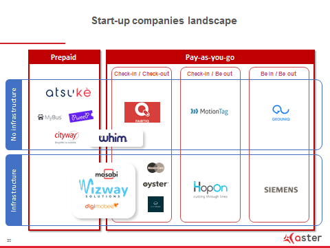 En parallèle, une myriade de start-up vibrionnent et rivalisent d’ingéniosité pour séduire les exploitants. Ces derniers, pour quelques milliers d’euros de paramétrage, peuvent tester des solutions améliorant l’expérience sans couture de leurs clients. Ainsi MotionTag effectue une preuve de concept Check-in/Be out avec la Deutsche Bahn grâce à la précision de son algorithme de géolocalisation ; la start-up israélienne HopOn déploie sa technologie de beacons ultrasons dans les bus de Tel-Aviv et Jérusalem ; Atsuke a déjà conquis une partie des villes suisses avec son système d’achat de billets par SMS et s’attaque désormais au marché français...