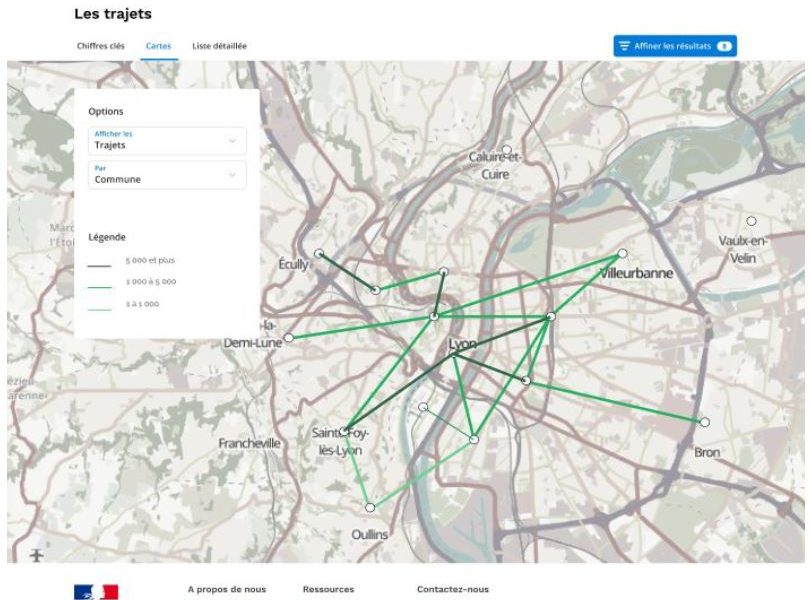 Le registre de preuve se développe également vers les employeurs pour leur salarié pour leur permettre également de concevoir, suivre et valider une bonne politique d’incitation au covoiturage. Grâce aux mécanismes de certification, les échanges de données entre les opérateurs et les collectivités via le registre (acteur neutre), permettent de constituer de nouvelles connaissances à forte valeur ajoutée pour les collectivités : la connaissance des flux covoiturés sur le territoire pour tous les opérateurs (exemple ci dessous à Lyon).